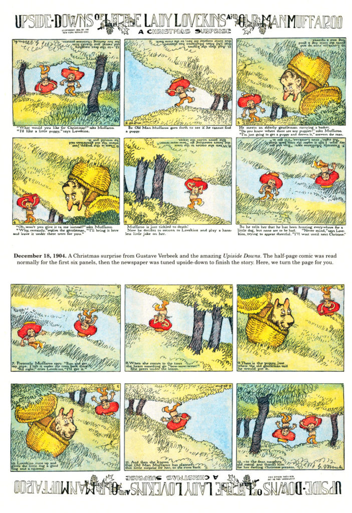 Autour de la même période, le hollandais Gustave Verbeck (1867-1937) apporte également sa pierre à l’édifice. Né au Japon, d’une mère française et d’un père néerlandais, il en partira pour étudier en Europe. De là, il décidera, finalement, d’aller s’installer aux Etats-Unis. Une fois sur place, il innovera dans le découpage narratif avec des illustrations qui feront date dans l’histoire de la BD. Dans sa série « Upside Downs of Little Lady Lovekins and Old Man Muffaroo » paru dans le New-York Herald de 1903 à 1905, il faudra ainsi retourner le périodique pour découvrir les histoires en miroir qu’il recèle. Au delà d’une certaine influence sur le manga, cet auteur est considéré comme un des pères de la bande dessinée moderne pour son audace et son inventivité.